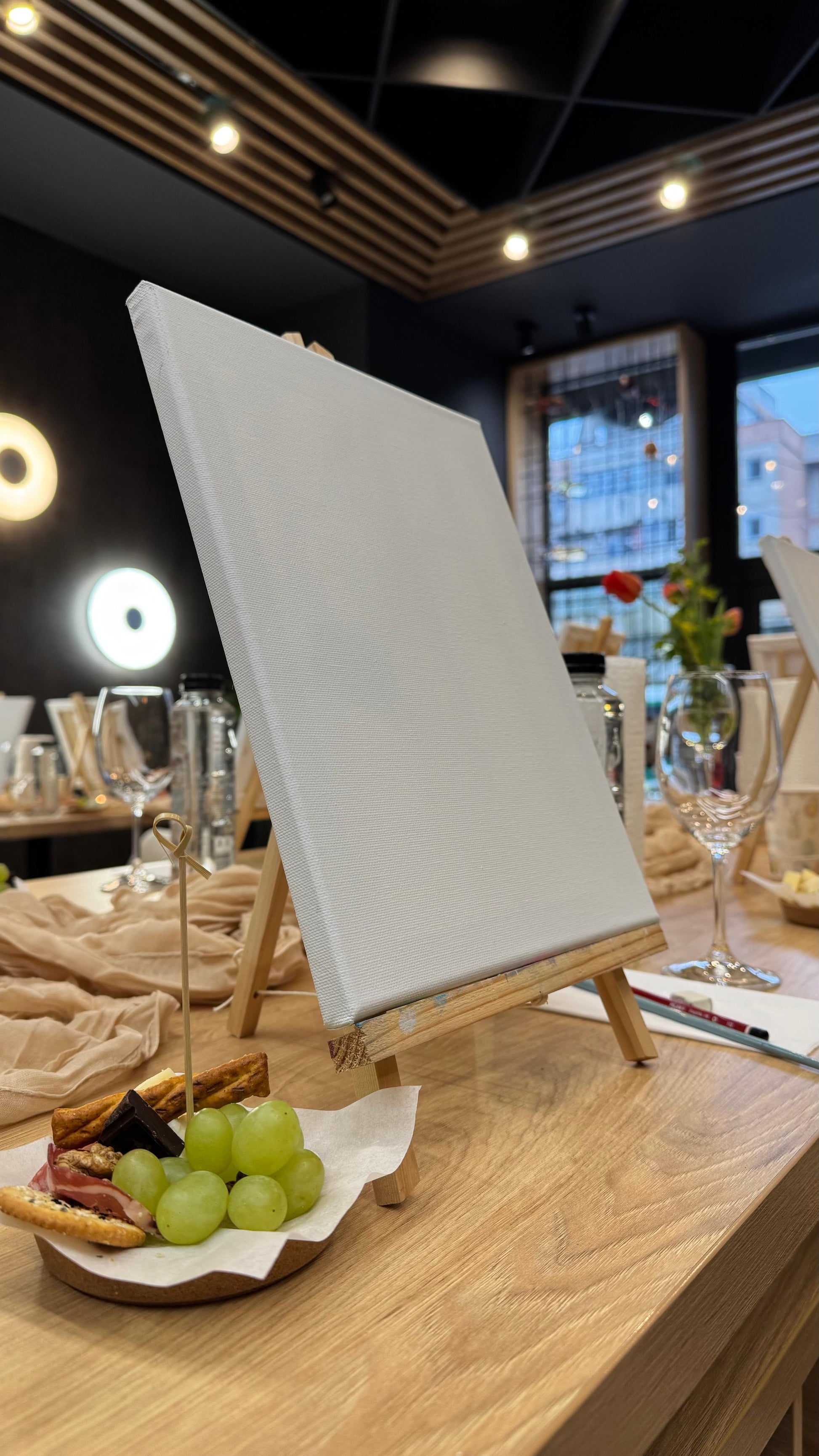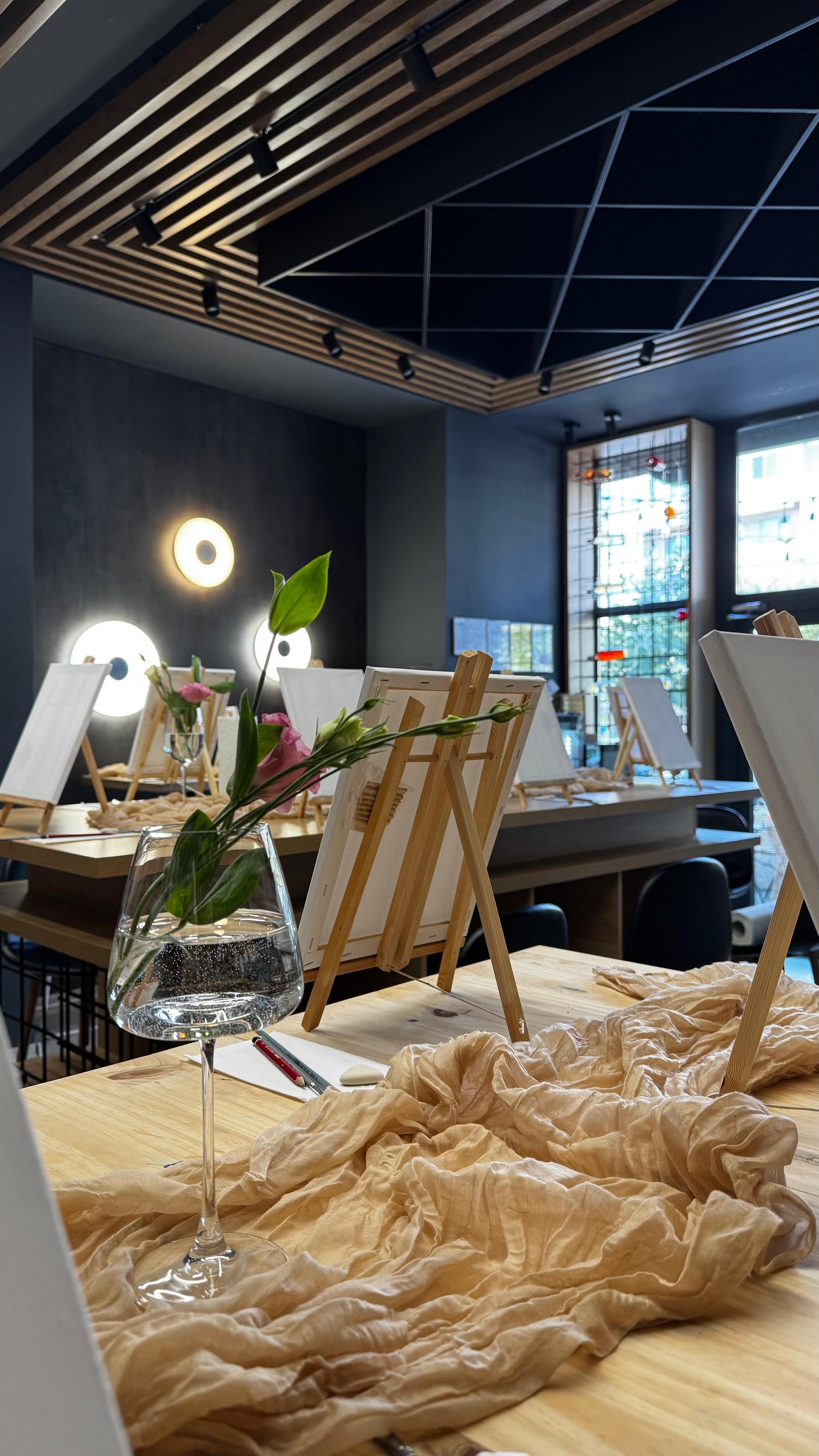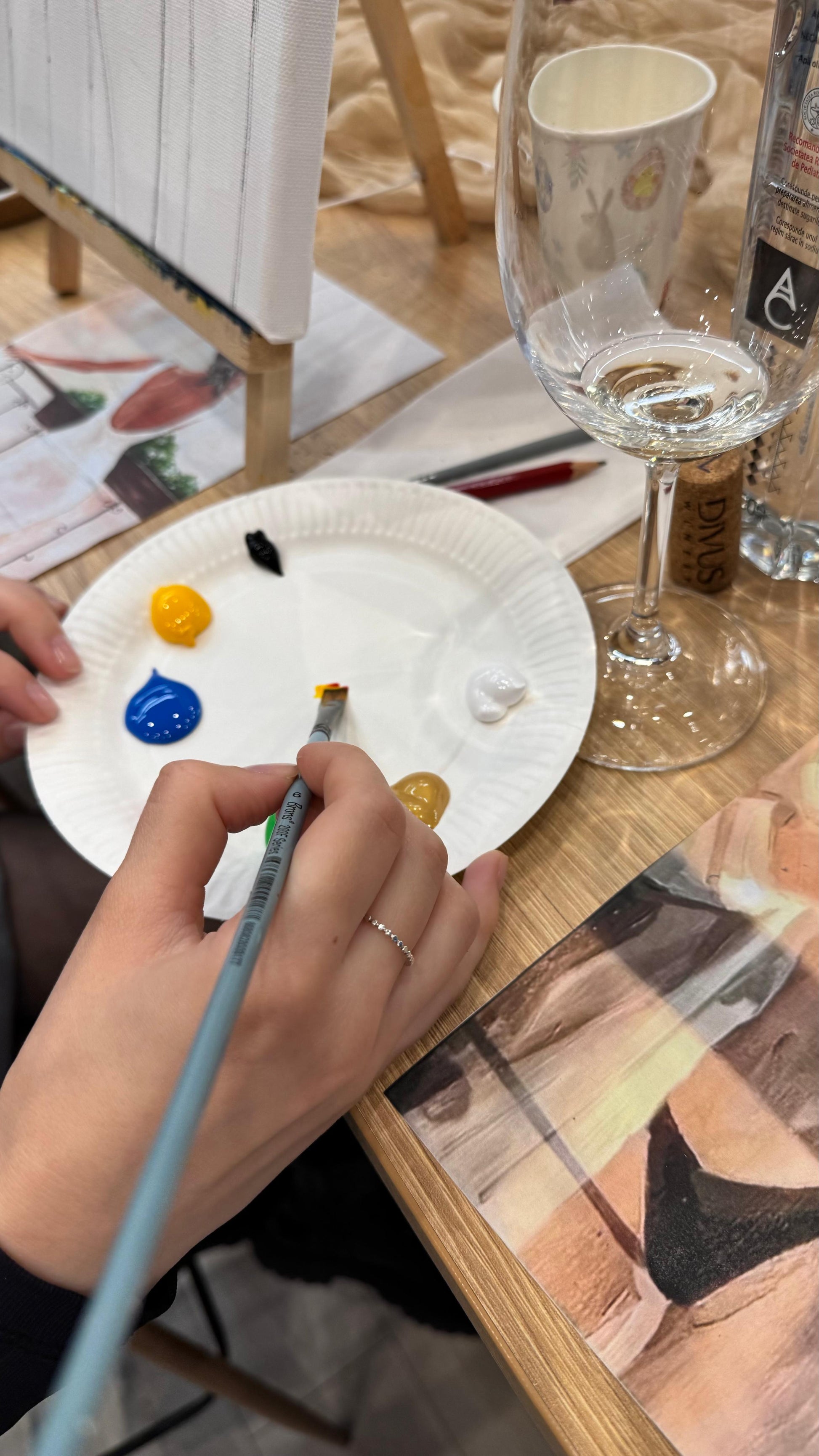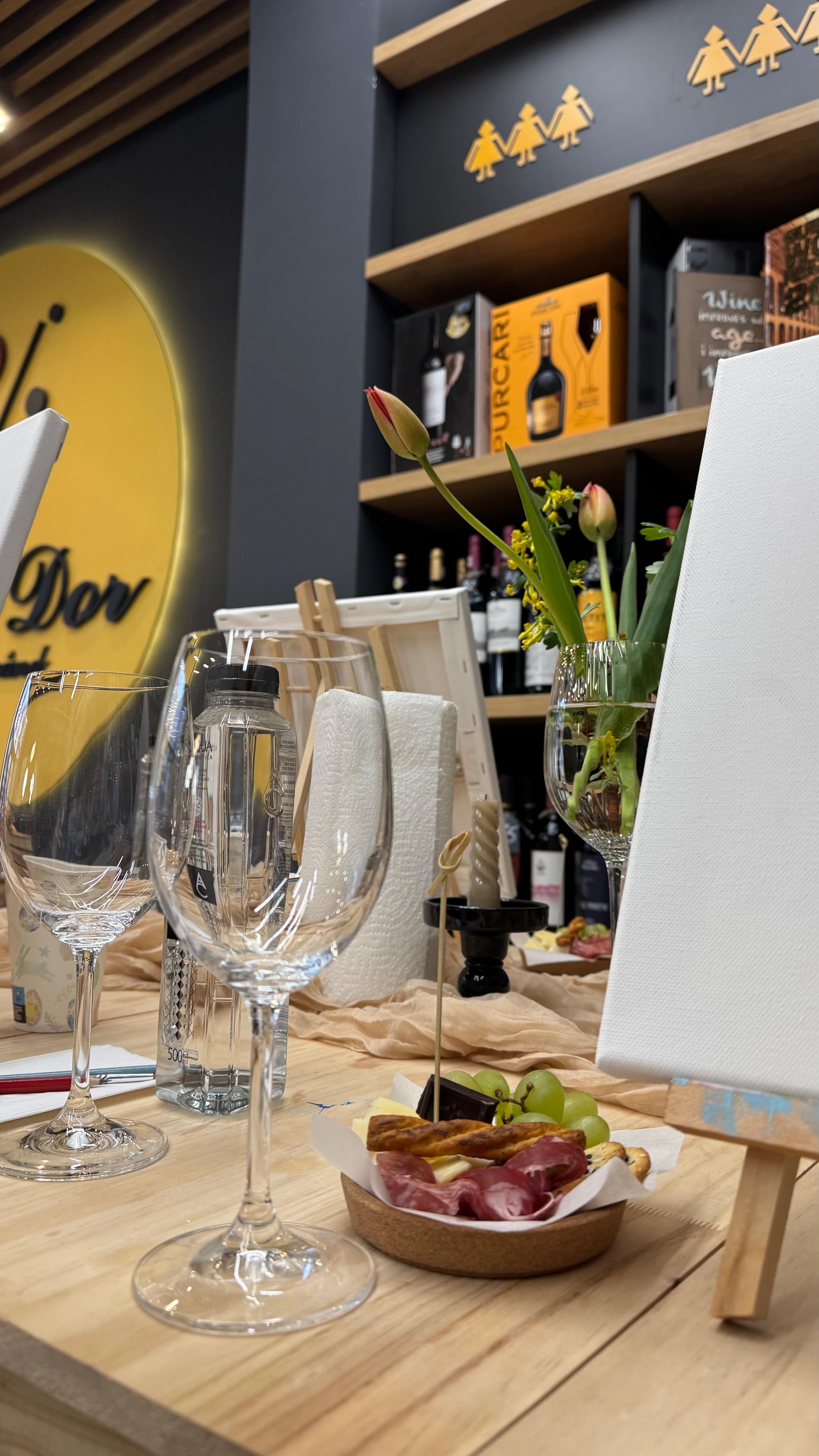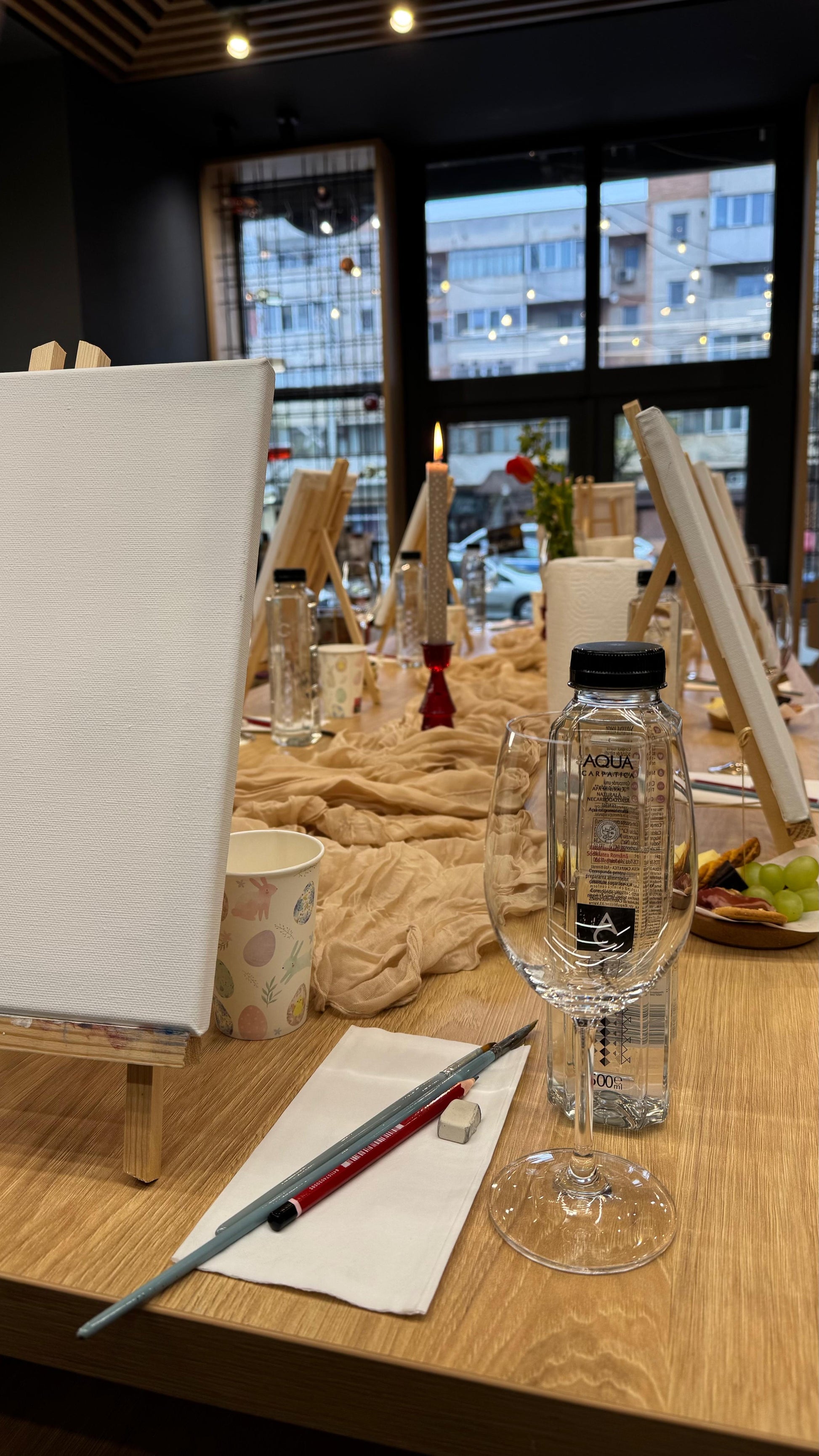 Include toate materialele de pictură, un pahar de prosecco și gustarea. ✨